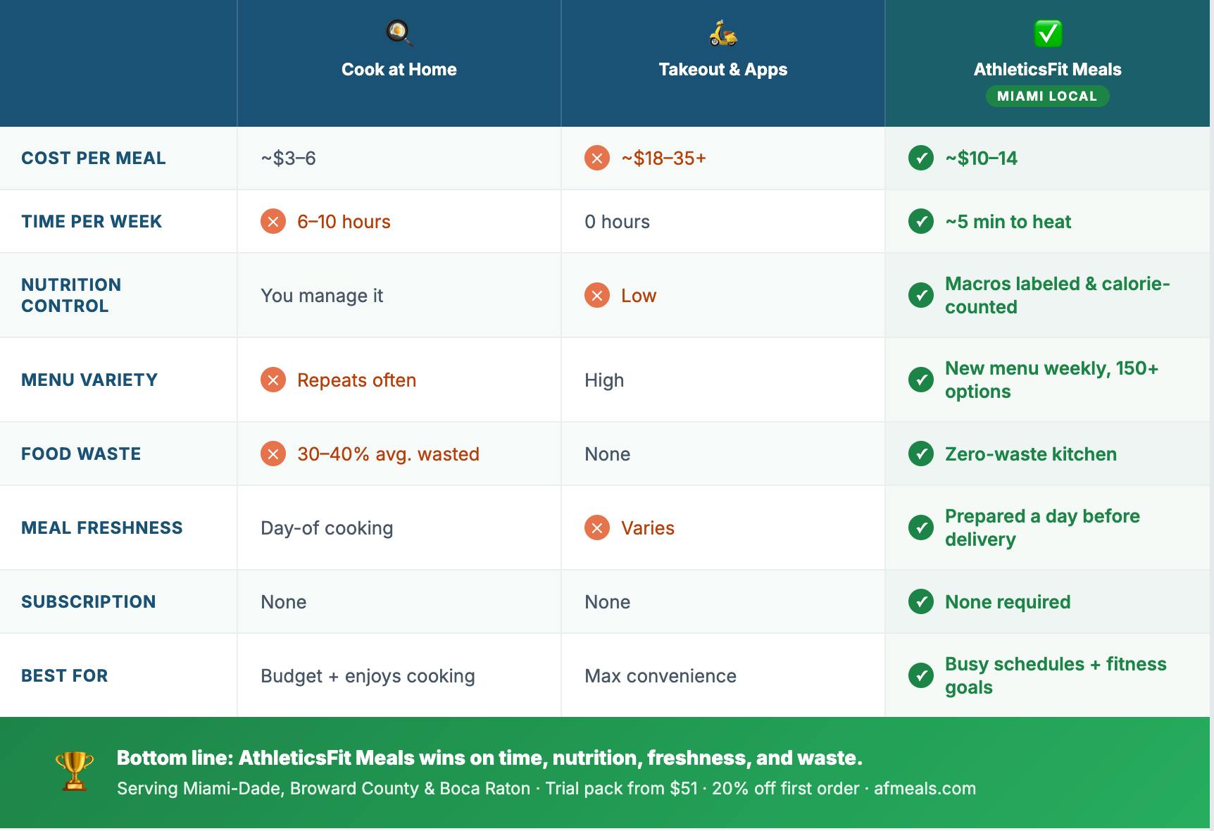 If you’re in Miami-Dade, Broward County, or Boca Raton, AthleticsFit Meals offers a trial pack starting from $51 — 4, 6, or 8 meals of your choice, no subscription required.